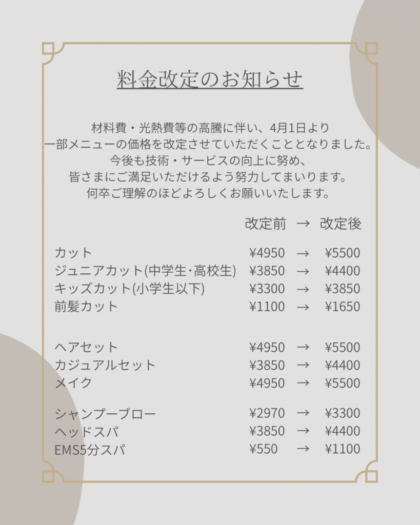 日頃から通ってくださっている皆さまにはご負担をおかけしてしまい心苦しいのですが、これからも技術・サービスの向上に努め、よりご満足いただける美容室であり続けられるよう努力してまいります。